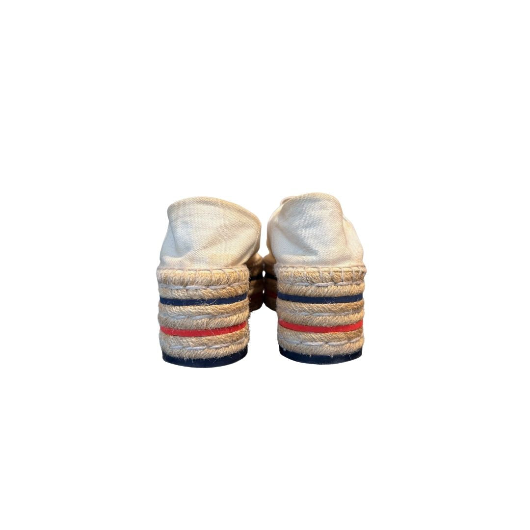 Alpargatas Gucci de segunda mano de lujo con plataforma en canvas y agujetas color ecrú con el logo de la marca a los costados.