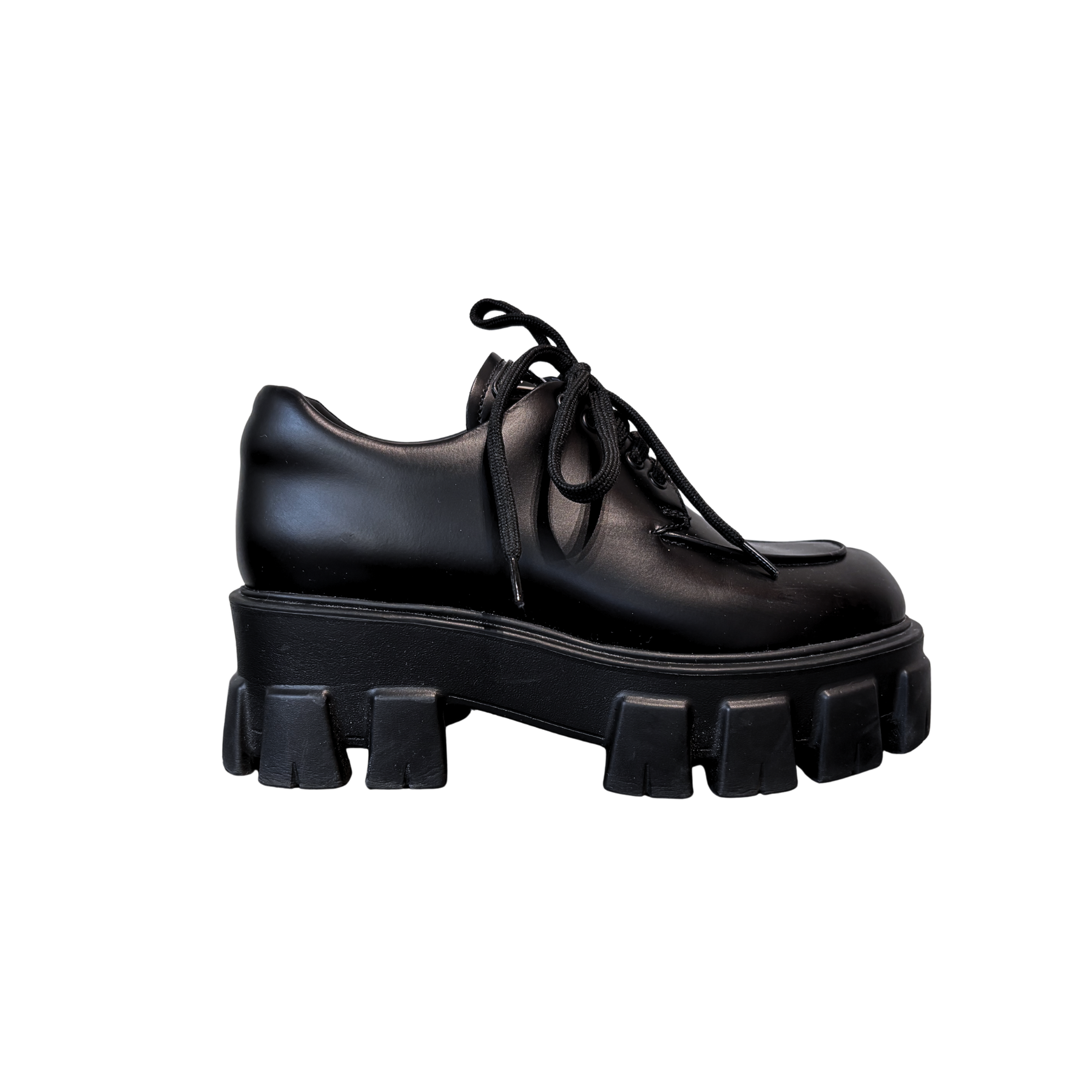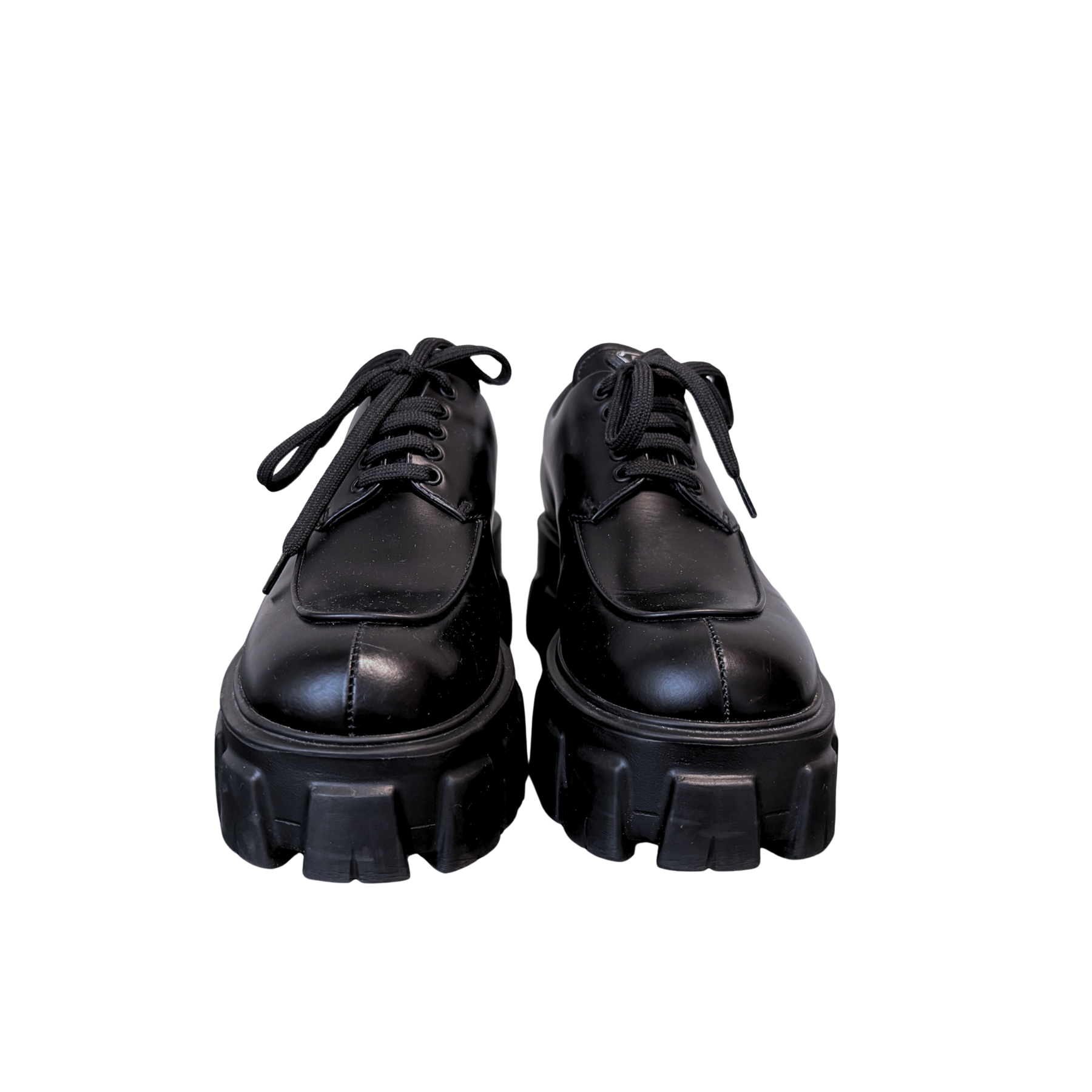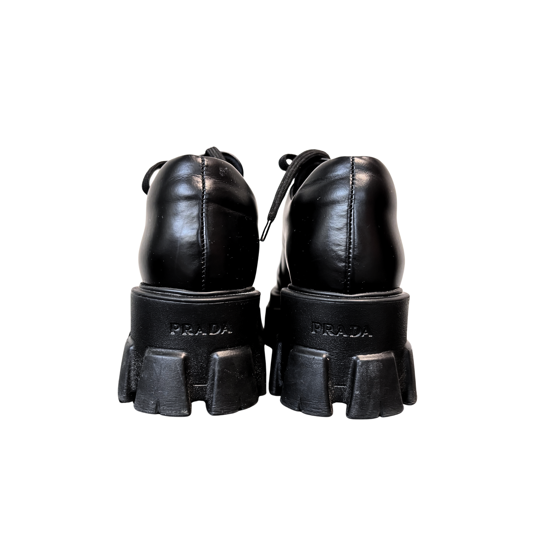 Zapatos Prada segunda mano de lujo modelo Monolith de piel cepillada con agujetas en color negro.