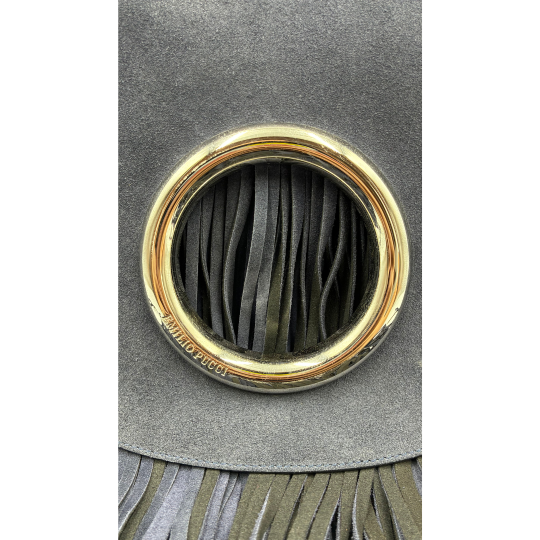 Bolsa Emilio Pucci de segunda mano en ante con flecos color azul marino, detalle de un aro en medio plateado, bolsa crossbody.