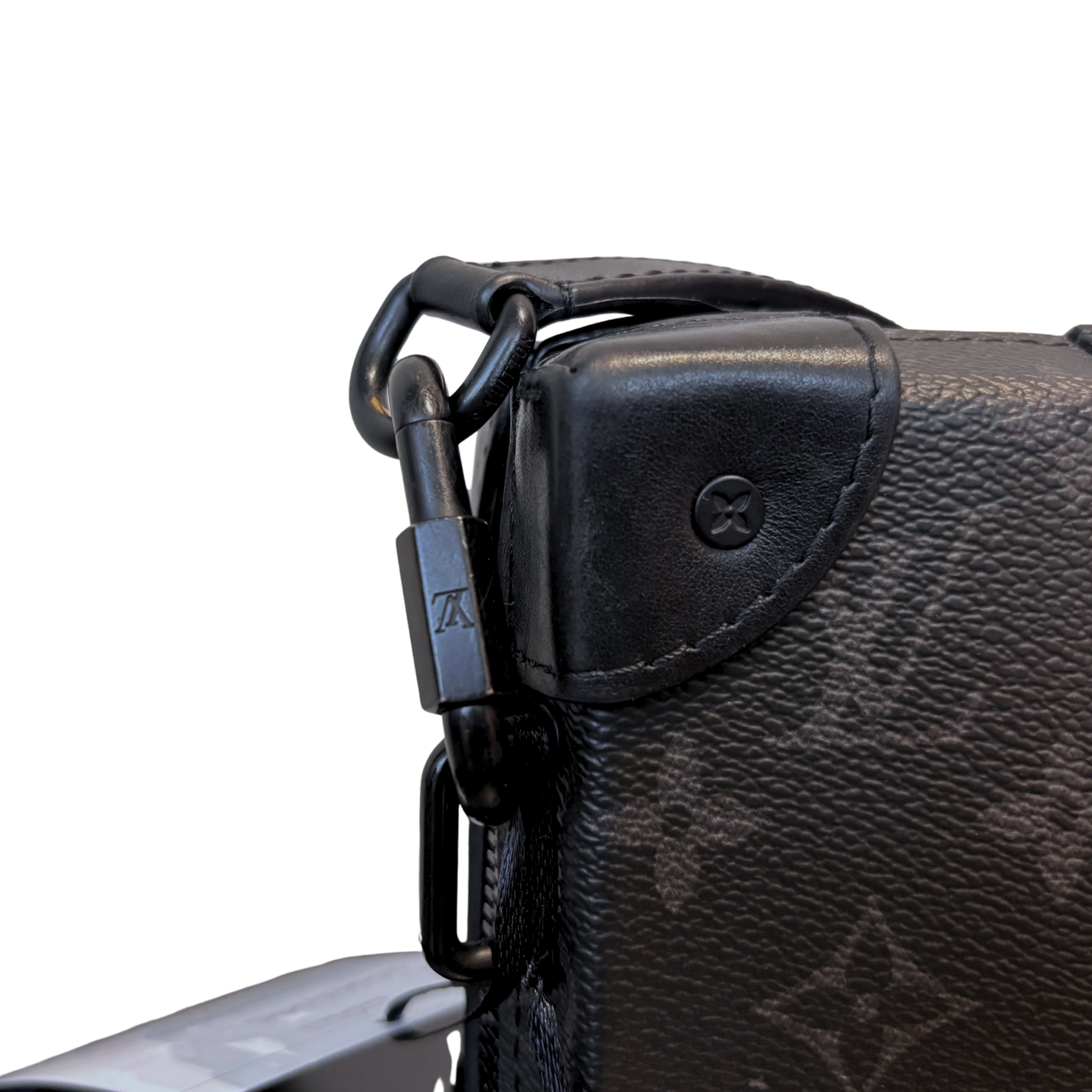 Bolsa Louis Vuitton de lujo segunda mano para hombre con correa Steamer, confeccionada en Monogram Eclipse, en piel color negro con gris, está inspirada en el baúl Steamer de la Maison.