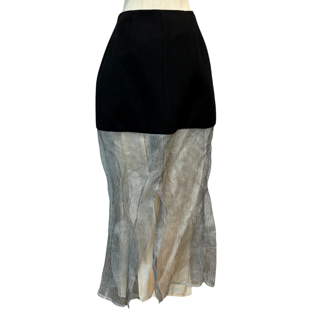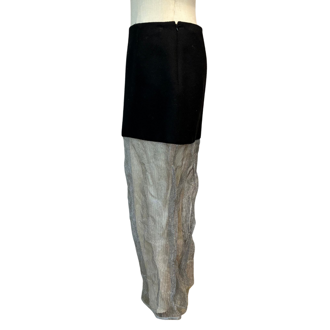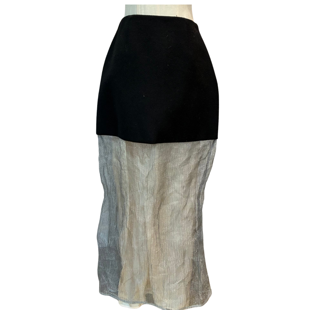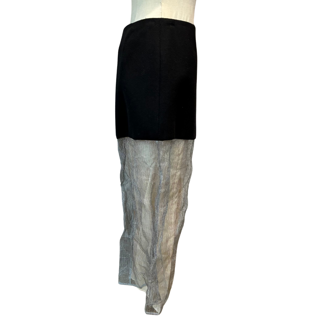 Falda en lana color negro con fondo color nude en seda y detalle traslucido en parte final de la falda. Talla: 48