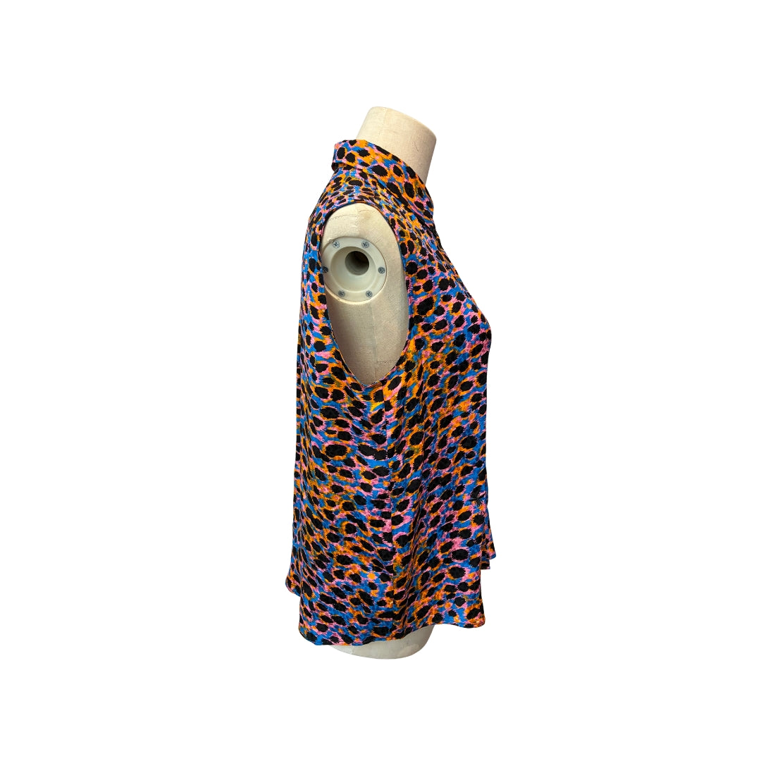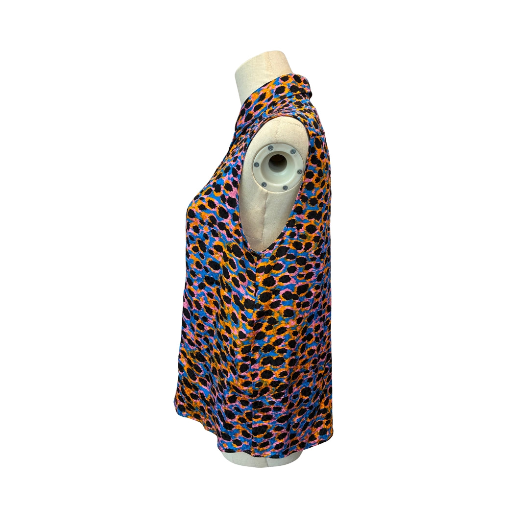 Top Dior preloved de seda sin mangas con cuello de camisa y botones en el centro en animal print naranja, azul y rosa.